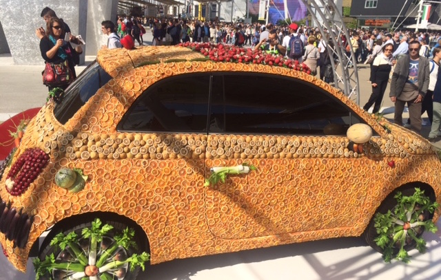 All’incrocio tra il cardo e il decumano nella piazza Italia dell’esposizione universale di Milano si può ammirare la Fiat 500 Arcimbolda. La macchina, bizzarramente ricoperta di frutta e verdura, vuole celebrare i sapori e la creatività italiani.