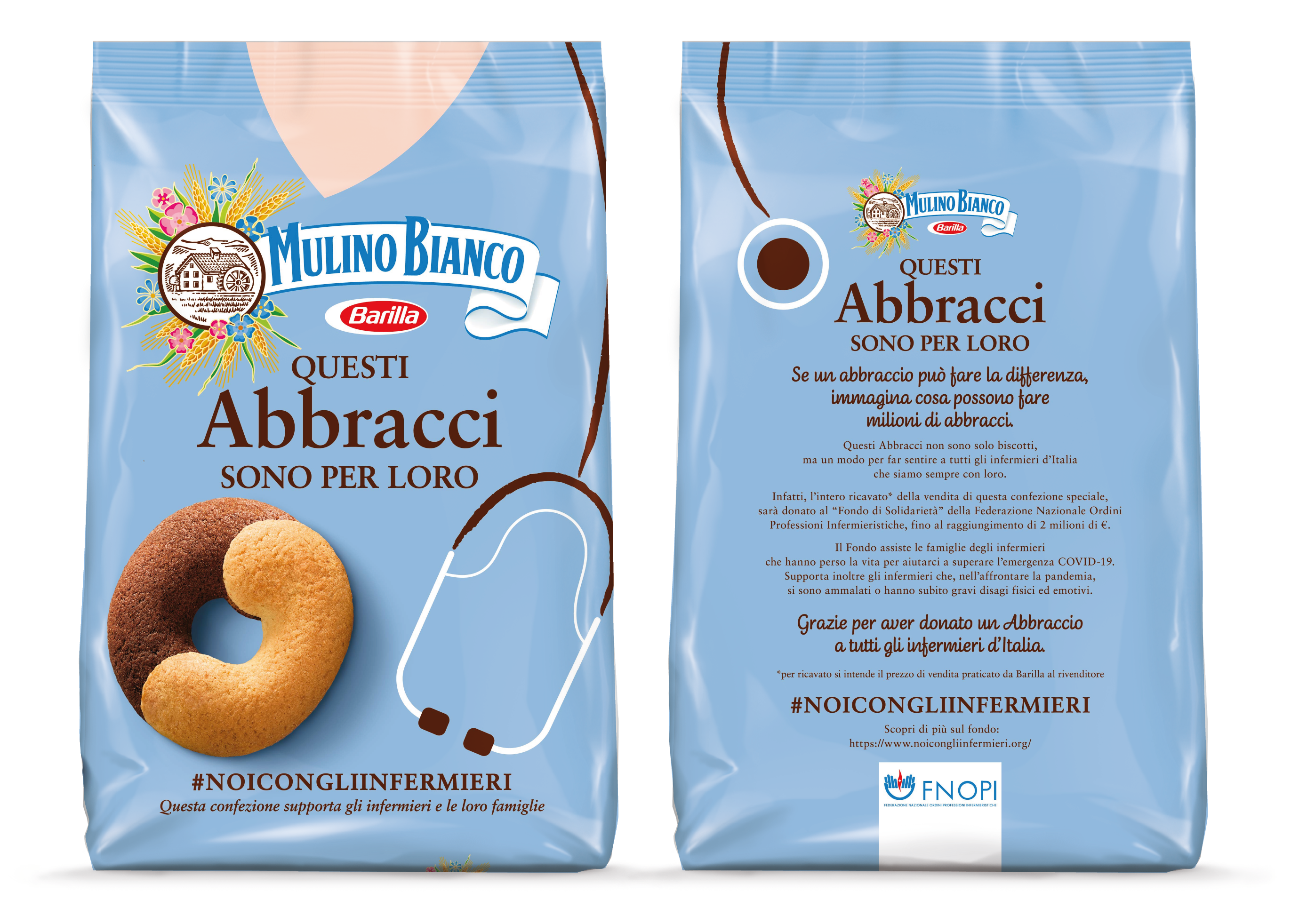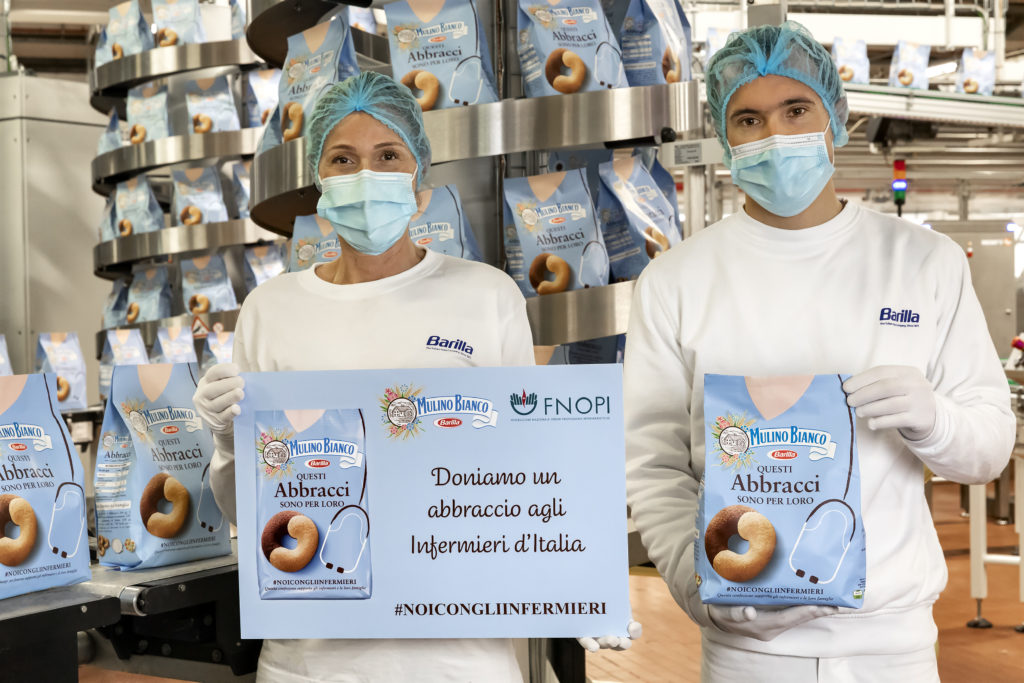 “Questi Abbracci sono per loro #NoiConGliInfermieri – Questa confezione supporta gli infermieri e le loro famiglie”, è quanto si legge sul pacco dei biscotti Abbracci del Mulino Bianco, confezionati in una veste speciale, per fare un regalo a tutti gli infermieri che dall’inizio dell’emergenza sanitaria hanno rischiato vita per salvare i malati di Sars-Cov 2. Il ricavato della vendita iniziata oggi e che durerà tutto il mese di gennaio, sarà devoluto alla Fnopi (Federazione nazionale ordini professioni infermieristiche) che rappresenta oltre 450mila infermieri in Italia. Lo scopo è di assistere le famiglie che hanno perso un familiare e supportare quanti, nell’affrontare la pandemia, si sono ammalati o hanno subito gravi stress fisici ed emotivi. Questa operazione di solidarietà che è previsto raggiunga i 2 milioni di euro, si aggiunge ad altre a sostegno del personale sanitario degli ospedali, dei banchi alimentari, delle associazioni locali e delle scuole.