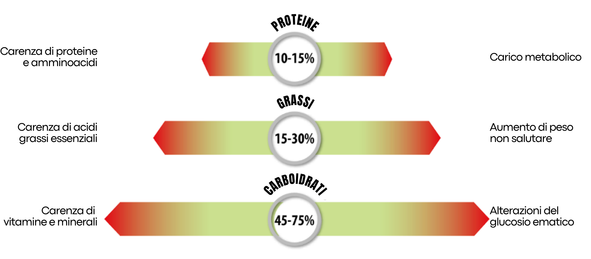 Gli stessi concetti sono espressi anche graficamente con le frecce che si allargano verso i due estremi ad indicare i valori minimi e massimi di sicurezza: il gradiente di colore verso il rosso indica negli estremi l’avvicinarsi verso modelli alimentari che possono comportare rischi per la salute. Invece rimanere nella zona verde centrale rappresenta il range ottimale (valori minimo e massimo) di macronutrienti da assumere.