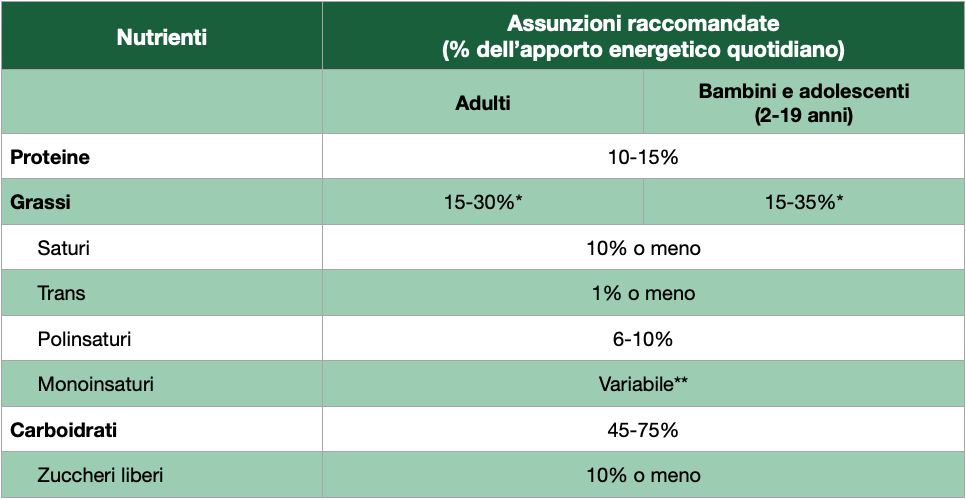 Ancora una volta viene ribadito di non superare la soglia del 10% delle calorie da zuccheri semplici aggiunti (zucchero bianco, miele, succhi di frutta, sciroppi…), idealmente non più del 5% per prevenire le carie. Questo è un punto su cui i LARN italiani non sono in linea con la FAO/OMS avendo scelto una classificazione degli zuccheri semplici diversa. 2)