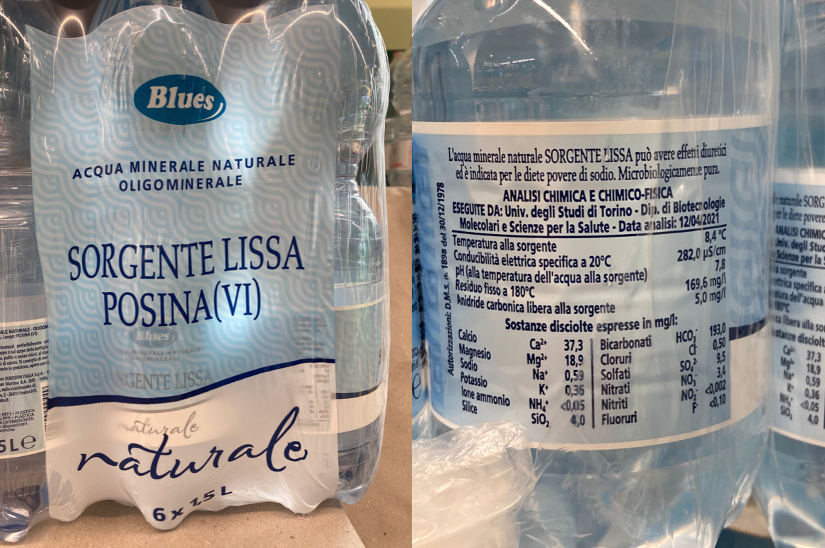 Nei supermercati Eurospin si trova anche l’acqua oligominerale a marchio Blues (altro brand che caratterizza i prodotti della catena): in bottiglie da 1,5 litri, proviene dalla sorgente Lissa, a Posina (Vicenza), ed è venduta a 0,17 € litro. Il costo per le bottigliette da 500 ml a marchio Blues, sale a 0,32 € al litro perché, nei formati più piccoli, il costo della plastica ha un peso determinante. Sulla piattaforma di Eurospin troviamo un’altra acqua minerale a marchio Blues in formato da 1,5 litri: si tratta dell’acqua Pineta sorgente Sales, imbottigliata a Clusone (Bergamo) al prezzo di 0,17 €/litro.