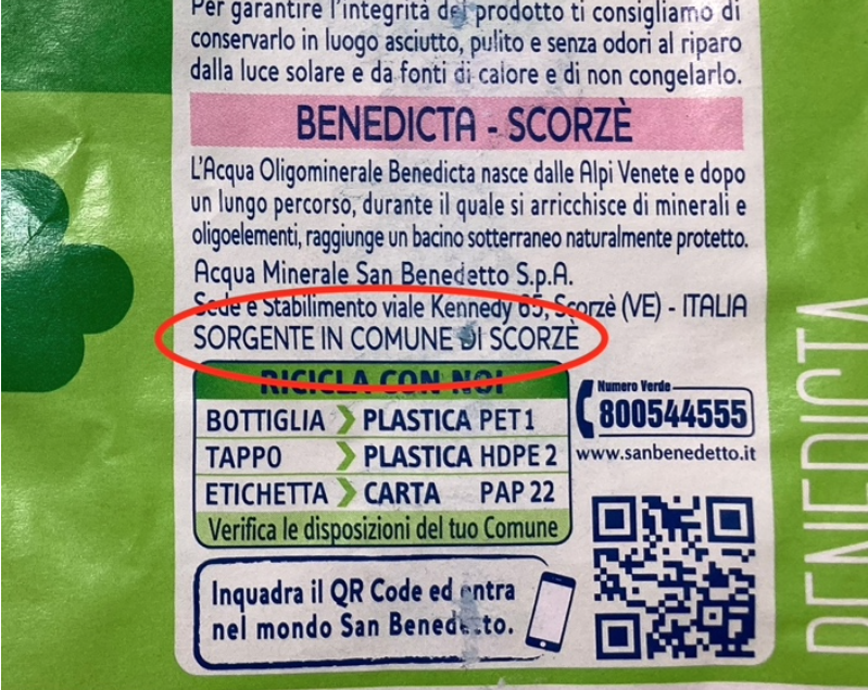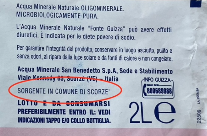 La cosa che lascia perplessi è la forte similitudine fra l’acqua San Benedetto Ecogreen Benedicta e l’acqua Fonte Guizza, che, osservando le etichette, sembrano uguali. La fonte si trova nella stessa località: Scorzè, in provincia di Venezia, nella zona delle risorgive dove, dopo un lungo tragitto nel sottosuolo, riemerge acqua proveniente dalle Alpi Venete. Probabilmente le sorgenti distano qualche centinaio di metri e hanno la medesima origine, visto che l’indicazione sull’etichetta riporta per la sede e per lo stabilimento il medesimo indirizzo (Viale Kennedy 65, Scorzè-VE).