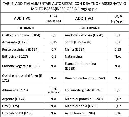 Purtroppo, nonostante la recente depurazione, nella lista degli additivi alimentari autorizzati ci sono ancora coloranti e conservanti con Dga “non assegnata” o bassissima (tab. 2). Un certo numero di questi additivi non è permesso negli Stati Uniti.
