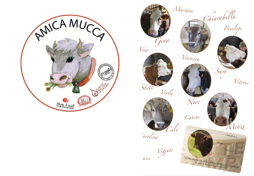 Dal 2015 in Trentino è possibile adottare una vacca della Valsugana o del Lagorai: dal sito dell’azienda per il turismo si riescono a visitare le malghe che partecipano al progetto, consultare le fotografie del bestiame e scegliere il capo che più si preferisce. Con un investimento di € 60 si ricevono prodotti caseari per un importo pari a 50 € (10 € vanno in beneficenza per progetti solidali) da ritirare direttamente in malga da metà giugno a metà settembre. Inaugurata nel 2017 è “Amica mucca della Latteria turnaria di Campolessi”, un’iniziativa che vuole sensibilizzare i consumatori sulle difficoltà delle aziende minori e creare un circuito solidale come esisteva nel passato. Nel suo tentativo di salvaguardare pascoli, saperi, mestieri antichi e tipologie di formaggi, la campagna – che prevede un versamento di almeno € 50 a fronte dei quali si riceve una selezione di prodotti confezionati con il latte della vacca adottata – vuole difendere la tradizione delle latterie turnarie un tempo diffusa in tutto in Friuli e oggi quasi scomparsa. Quella che una volta era riconosciuta come società di fatto aveva formalizzato l’usanza di mettere insieme il latte di più famiglie e caseificare collettivamente così da gestire il mercato del latte in modo più economico e facile, adatto alla produzione di piccola scala tipica del territorio friulano.
