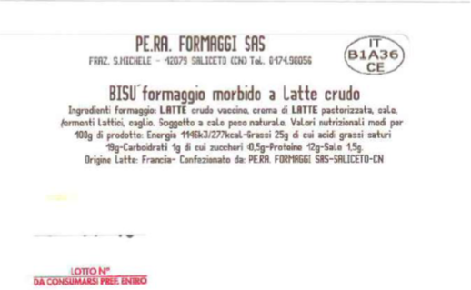 In Italia per il momento ad essere coinvolto nel richiamo e nel ritiro è il formaggio morbido Bisù nella confezione da 180 grammi venduto dall’azienda PE.RA Formaggi S.a.S. di Saliceto Cuneo (marchio dello stabilimento FR 26.281.001). I lotti coinvolti sono: 19066, 19087, 19102. Non abbiamo altre informazioni, anche se è possibile che nelle prossime ore l’elenco dei marchi italiani coinvolti possa allungarsi. Per il momento le catene di supermercati italiane non hanno diramato alcun avviso.