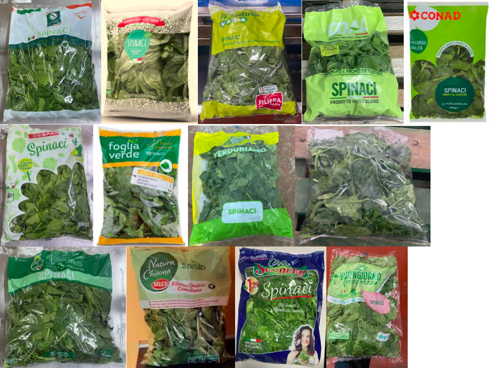 Il richiamo riguarda gli spinaci freschi confezionai in busta venduti nei supermercati: Eurospin Foglia Verde, Unes Maxi Buongiorno Freschezza, Penny Market Natura È, Despar, Conad Percorso Qualità, I Colori del Sapore Aldi, Sendero Gial Srl, Natura VALE e Natura Chiama Selex, Selezione Qualità Gabrielli, Ambruosi & Viscardi in formato da 350 grammi, 500 grammi e 250 grammi, COAL.