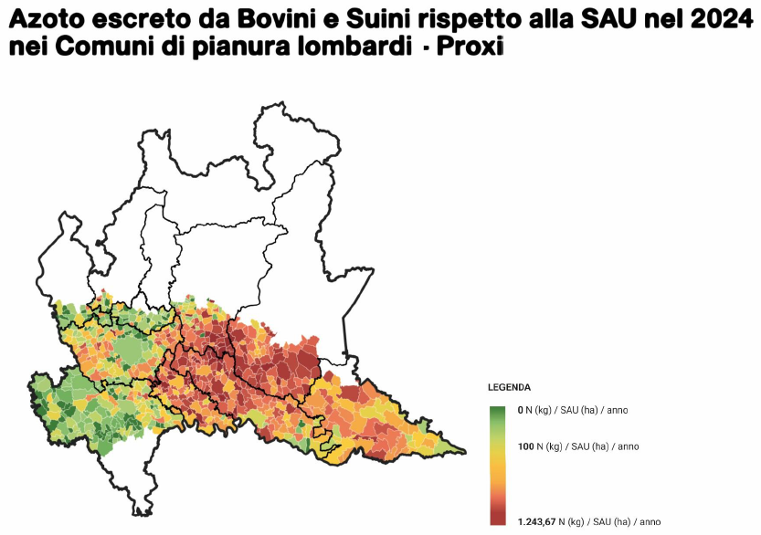 Dunque, con il 15% della popolazione umana, la regione gestisce tra il 25% e il 50% della produzione zootecnica nazionale. Non siamo in presenza di un deficit per il fabbisogno locale, ma di un polo produttivo intensivo che esporta in tutta Italia e all’estero. Il problema non è la quantità di cibo in sé, ma il fatto che questo numero sproporzionato di animali è concentrato su una superficie che rappresenta solo il 7,9% del territorio nazionale, portando la densità di ammoniaca e nitrati oltre i limiti fisici di assorbimento del suolo.