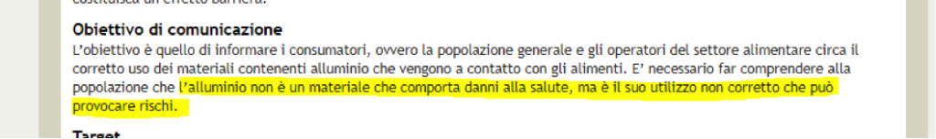 1. Striscia la notizia. Lei parla di “marasma” sollevato dal nostro servizio e per rafforzare il concetto cita sia il Ministero della Salute sia un precedente articolo de il Fatto Alimentare, scrivendo «L’alluminio non è un materiale che comporta danni alla salute. È l’utilizzo scorretto che può comportare rischi». Peccato che proprio il documento del ministero da lei citato riporti: « L’Alluminio, onnipresente nella nostra vita quotidiana, è uno dei metalli con riconosciuta potenziale pericolosità per la nostra salute, anche considerando la presenza diffusa in molti alimenti e in molti altri prodotti di consumo. L’alluminio interferisce con diversi processi biologici (stress ossidativo cellulare, metabolismo del calcio, etc.), pertanto può indurre effetti tossici in diversi organi e sistemi: il tessuto nervoso è il bersaglio più vulnerabile».