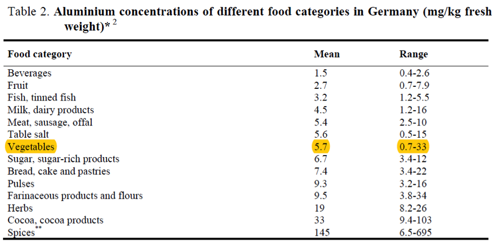 Secondo l’EFSA, i vegetali contengono in media oltre 5 mg/Kg di alluminio con un range variabile da 0.7 mg/Kg fino a 33 mg/Kg.