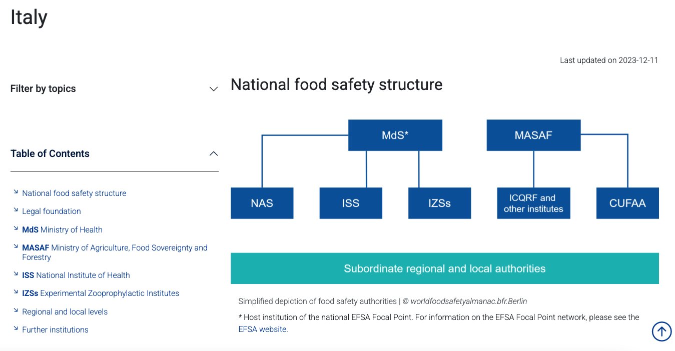 Per ogni Paese, l’Almanacco mostra la struttura delle istituzioni responsabili per la sicurezza alimentare e tutte le tematiche di cui si occupano: per esempio, per l’Italia la responsabilità è condivisa tra Ministero della Salute, a cui afferiscono Carabinieri NAS, Istituto Superiore di Sanità e Istituti Zooprofilattici Sperimentali, e Ministero dell’Agricoltura, della Sovranità alimentare e delle Foreste (MASAF), a cui fanno riferimento l’Ispettorato centrale repressione frodi (ICQRF) e i Carabinieri forestali (CUFAA).