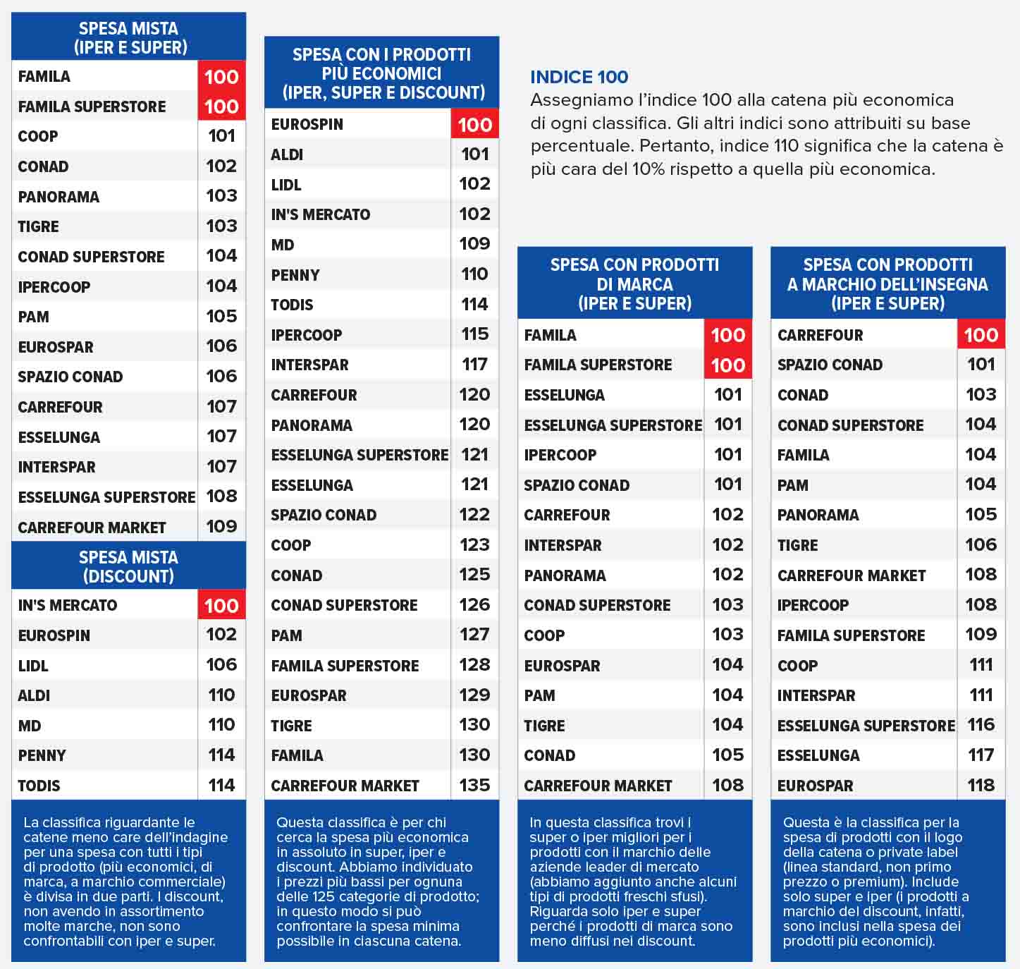 Per chi frequenta abitualmente gli hard discount e sceglie i prodotti più economici sullo scaffale (che gli addetti ai lavori definiscono “primi prezzi”), il risparmio maggior si ottiene nei punti vendita Eurospin (indice 100), seguito da Aldi (101), Lidl e In’s Mercato (102). Se invece il carrello si riempie di prodotti che riportano in etichetta il marchio dell’insegna, le cosiddette “private label”, che generalmente si collocano in una fascia di prezzo intermedia tra i marchi leader e i prodotti più economici, la catena più conveniente è Carrefour (100), seguita da Spazio Conad (101) e Conad (103). Chi invece ha l’abitudine di comprare solo prodotti di marche famose, che in genere fanno pubblicità in TV, la catena più competitiva è Famila, insieme a Famila Superstore (100), seguita da Esselunga, Esselunga, Esselunga Superstore, Ipercoop e Spazio Conad.