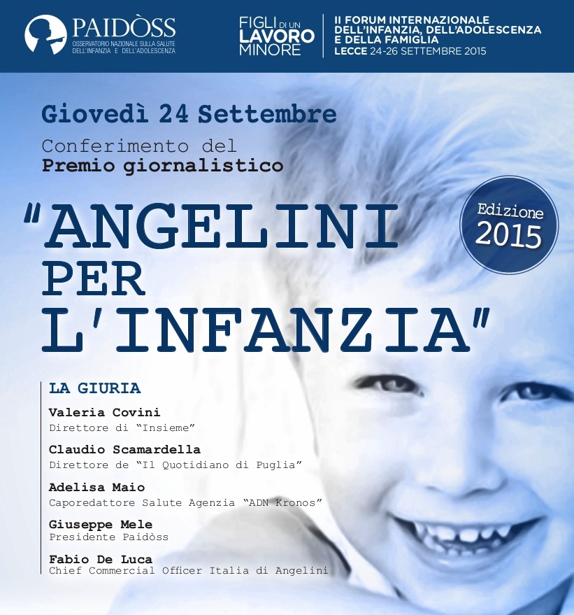 La giuria, composta da Valeria Covini (Direttore di “Insieme”), Claudio Scamardella (Direttore de “Il Quotidiano di Puglia”), Adelisa Maio (Caporedattore Salute Agenzia “ADN Kronos”), Giuseppe Mele (Presidente Paidòss) e Fabio De Luca (Chief Commercial Officer – Italia di Angelini) ha riconosciuto la valenza del pezzo “Il menù tipo di un bambino contiene il doppio dei grassi saturi consigliati. Troppo olio di palma. Le proposte alternative di Margherita Caroli”, pubblicato sul nostro sito l’11 agosto 2015.