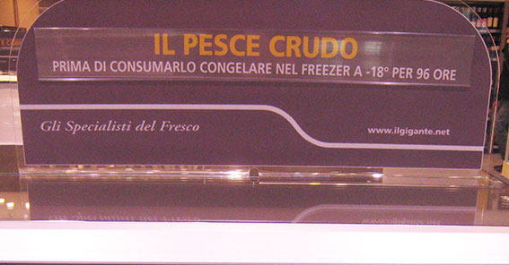 Cartello esposto nel banco pesce fresco dei supermercati Il Gigante che invita a congelare il prodotto prima di consumarlo crudo (Foto: Retail Watch)