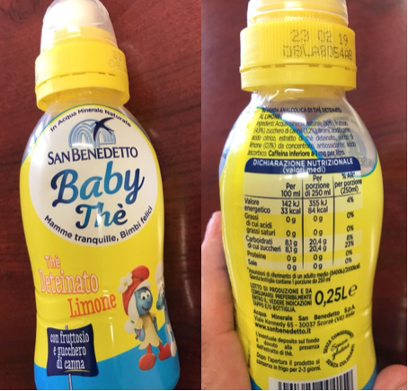 sono un vostro lettore da molti anni e oggi ho pensato di darvi un po’ fastidio condividendo con voi ciò che ho trovato in una bevanda venduta per bambini. Si tratta del Baby Thè di San Benedetto dove è presente il 4,9% di fruttosio e il 3,2% di zucchero di canna. La percentuale di thè non si capisce e di limone ce n’è solo lo 0,1%. È presente la caffeina! È possibile ritenere per i bambini una bevanda fatta così? Io non l’ho fatta bere a mio figlio di due anni e, secondo il mio gusto, è fin troppo dolce.