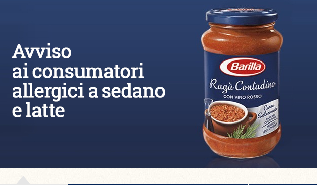 Barilla invita i consumatori allergici a sedano e/o latte a non utilizzare il prodotto e a contattare il Numero Verde 800862323 per qualunque informazione si rendesse necessaria.