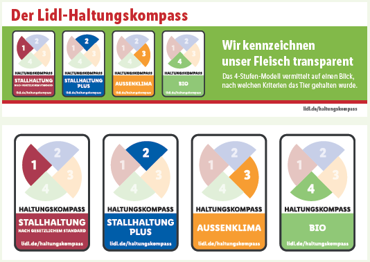 In questo gruppo, si trova anche Lidl, una delle 19 imprese che migliora il proprio posizionamento rispetto al precedente rapporto. La catena di hard discount accresce il suo impegno verso gli animali nei diversi Paesi in cui è presente: per esempio nei Paesi Bassi ha contribuito allo sviluppo della uova Kipster, prodotte in maniera sostenibile e con alti standard di benessere, mentre in Germania ha introdotto un sistema di etichettatura trasparente sul tipo di allevamento per i prodotti a base di carne (vedi schema sotto).