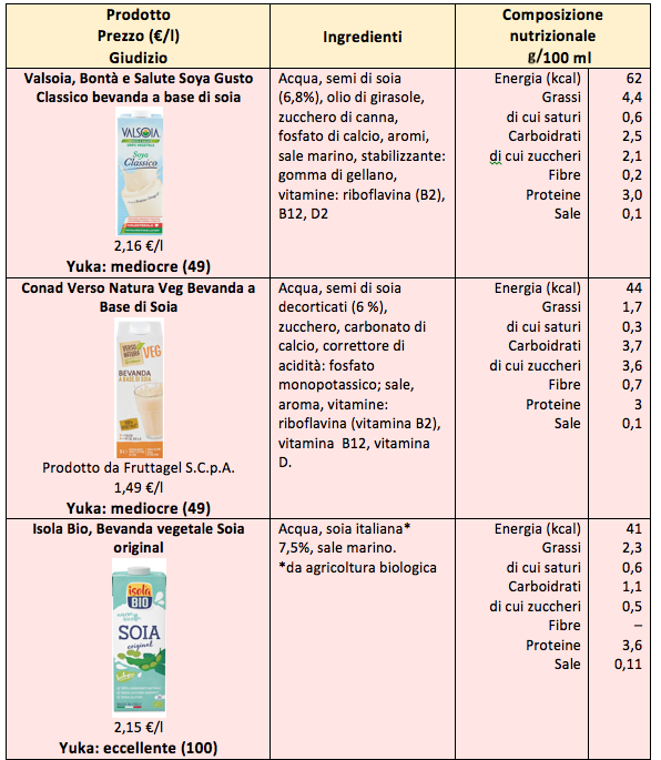 La quota di proteine è inferiore a quella del latte (3,5 g/100ml) tranne che nelle bevande di soia, che possono avere un contenuto proteico analogo. Per quanto riguarda le scritte sulla confezione, non si individuano differenze apprezzabili fra le bevande che riportano dichiarazioni nutrizionali e quelle che ne sono prive. Il contenuto medio di zuccheri delle bevande che hanno sulla confezione la frase “senza zuccheri aggiunti” non è inferiore a quelle prive di questa dicitura. Nemmeno la provenienza da agricoltura biologica può essere considerata di per sé garanzia di maggiore qualità nutrizionale.