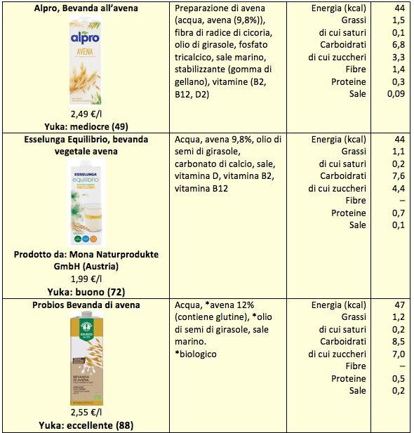 Per una valutazione globale abbiamo usato l’app Yuka che, oltre a considerare gli aspetti nutrizionali, in base al Nutri-score francese, prende in esame anche la presenza di additivi più o meno “rischiosi” per la salute. Dal punto di vista nutrizionale nessuna delle bevande che abbiamo considerato presenta aspetti penalizzanti e la differenza si basa soprattutto sull’uso o meno di additivi. Sono giudicate mediocri le bevande alla soia a marchio Valsoia e Conad, la bevanda di avena Alpro, e quella di riso Esselunga, per la presenza di fosfato di calcio o fosfato potassico, sostanze ad azione antiossidante e stabilizzante considerate poco consigliabili (potrebbero alterare il metabolismo del calcio e aumentare il rischio di malattie cardiovascolari).