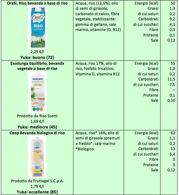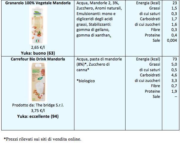 Il primo aspetto che emerge, oltre al gran numero di tipologie diverse, sono le notevoli differenze fra un tipo e l’altro, in base alla materia prima vegetale da cui sono ricavate. Le bevande a base di riso sono più ricche in carboidrati, mentre quelle ricavate da soia e mandorla sono le più scarse in termini di carboidrati ma hanno il contenuto più alto di grassi. Le più ricche di proteine sono quelle a base di soia, mentre il sale è sempre molto scarso in tutte le tipologie.