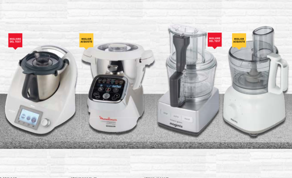 In vetta alla classifica c’è Bimby TM5 il famoso robot firmato da Vorwerk che con il suo ultimo modello ottiene il massimo punteggio in quasi tutte le prove di laboratorio, soprattutto nella preparazione delle pappe per bambini, nell’impasto e nella cottura, anche a vapore. Il nuovo Bimby ha la bilancia incorporata, un boccale più ampio del precedente, uno schermo tattile intuitivo e un’unica manopola per tutte le funzioni. L’unica pecca è l’ingombro e il peso. Secondo Altroconsumo si tratta di un ottimo acquisto se si cucina molto, se si ha lo spazio sul piano della cucina, e se si vogliono spendere 1.200 euro.