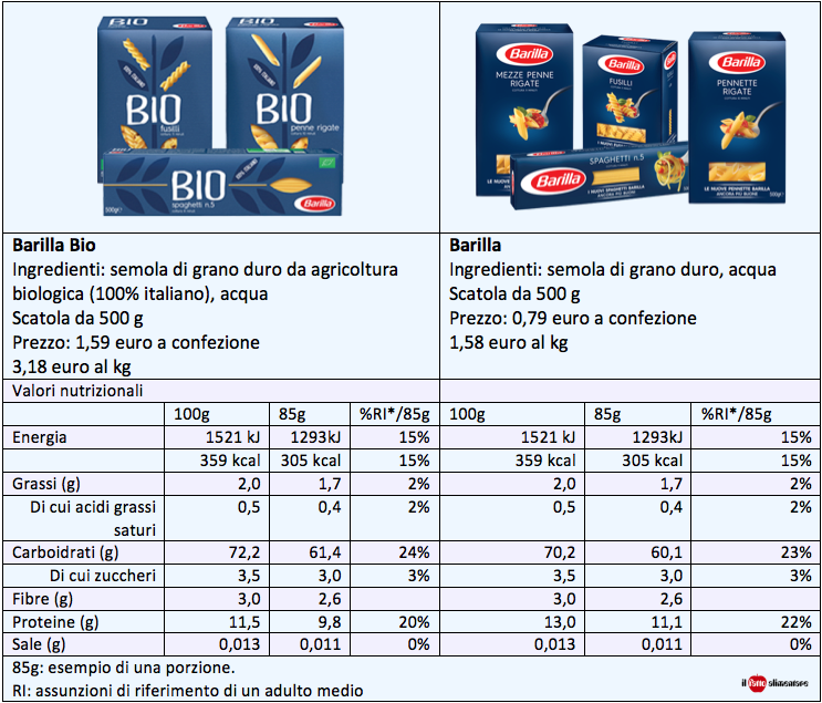Sullo scaffale a fianco di Bio Barilla troviamo un’altra pasta biologica con il marchio Esselunga Bio al prezzo di 0,88 € a confezione da 500 g, prodotta dal pastificio Attilio Mastromauro – Granoro srl. La differenza di prezzo è ampia e mette in difficoltà il consumatore che rimane disorientato perché non trova valide giustificazioni. Qualcuno può pensare all’origine italiana della materia prima, ma non è così, perché la pasta bio Esselunga è prodotta con grano 100% italiano. Certo Barilla essendo leader di mercato e specialista può puntare ad un posizionamento più alto e quindi può proporre un prezzo maggiore, ma in questo caso il divario con Esselunga è davvero esagerato visto che la marca del distributore costa quasi la metà. L’introduzione del leader del mercato della pasta di semola bio sarà un elemento che contribuirà a far crescere i consumi e dovrebbe comunque contribuire a ridurre i prezzi.