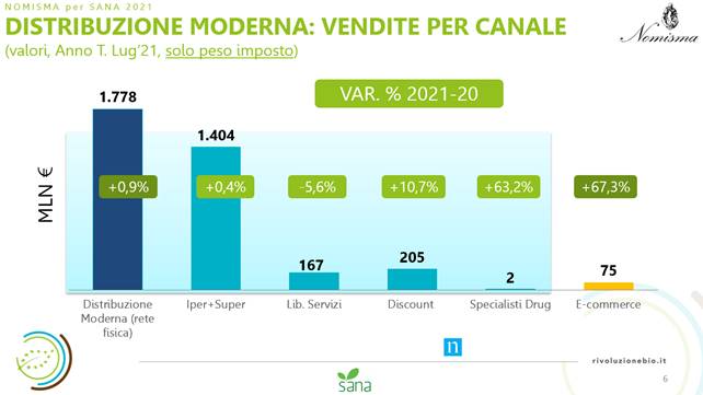 Il settore continua a macinare risultati positivi anche fuori dal mondo digitale. Nel 2021 è già stata registrata una crescita del 5% rispetto all’anno precedente. La distribuzione nei negozi fisici resta il canale di vendita privilegiato, con un giro d’affari per il biologico di quasi 1,8 miliardi di euro (+0,9%). In particolare i consumatori italiani hanno acquistato prodotti bio per oltre 1,4 miliardi euro nei supermercati e negli ipermercati, con un aumento dello 0,4% rispetto al 2020, mentre crescono di più le vendite nei discount (+10,7%), che raggiungono quota 205 milioni di euro. Sono in calo invece gli acquisti nei negozi biologici specializzati (-5,6%), mentre aumentano di molto quelli nei punti vendita specializzati in prodotti per la casa e la persona (+63,2%), che però rappresentano solo un piccolissima frazione del giro d’affari del biologico (2 milioni).