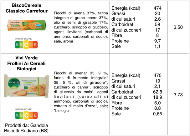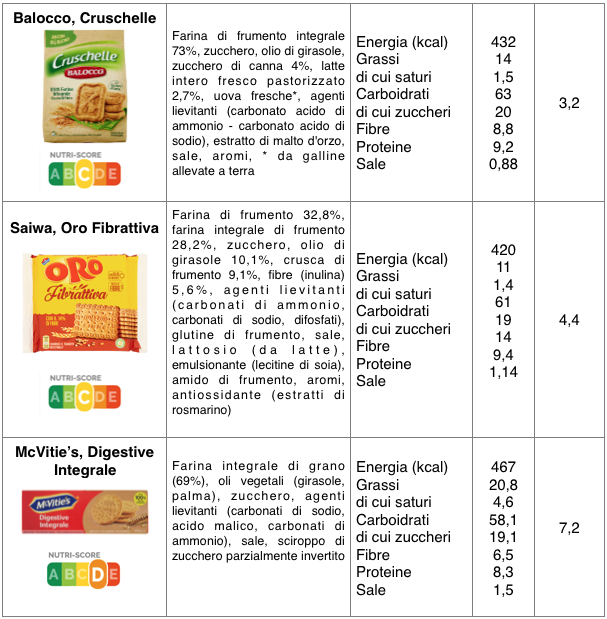 Calcolando il Nutri-Score – sistema di valutazione nutrizionale che prevede cinque lettere e cinque colori, dalla A verde, per gli alimenti da consumare liberamente, alla E rossa, per quelli da mangiare con più attenzione – questi biscotti ottengono nella maggior parte dei casi una valutazione intermedia C con bollino giallo. Questa tiene conto del contenuto moderato di grassi (prevalentemente insaturi) e di sale, del contenuto di zuccheri, valutato elevato, e della buona quantità di fibra. Un giudizio di questo tipo è sicuramente apprezzabile per dei biscotti, se pensiamo che prodotti come i wafer e i Nutella Biscuits, molto ricchi di grassi e zuccheri, ricevono una E, mentre la maggior parte dei frollini (dalle Macine Mulino Bianco alle Gocciole Pavesi) riceve una D. Gli unici biscotti, fra quelli considerati, che meritano una D, sono i Digestive e i Gran Cereale al cioccolato, i primi per l’eccesso di grassi, i secondi per gli zuccheri.