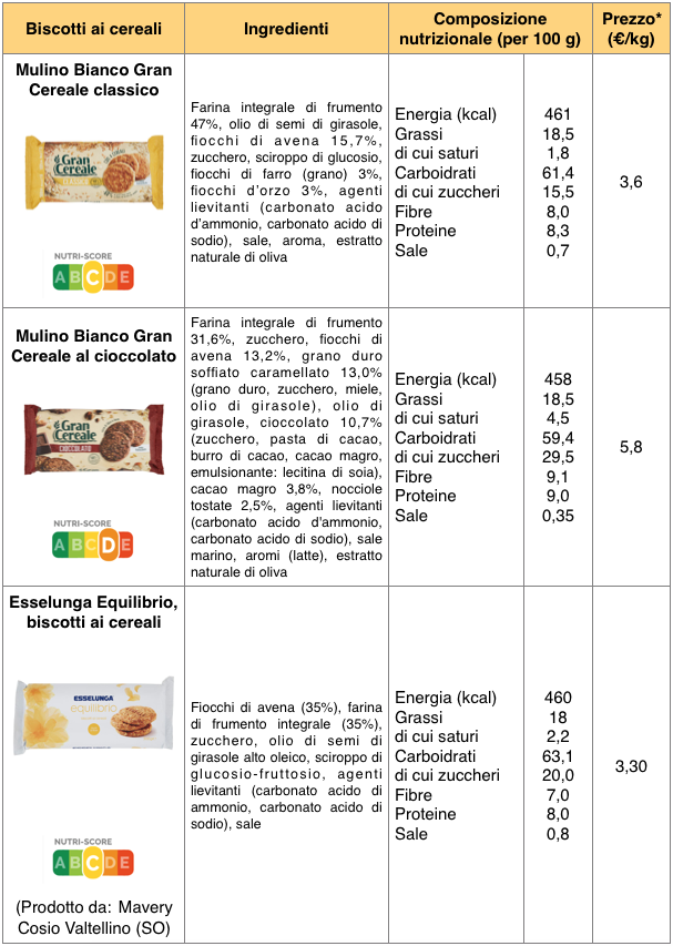 Nel complesso, a parte i due biscotti un po’ più grassi, i prodotti analizzati hanno caratteristiche nutrizionali piuttosto simili. I prezzi invece sono diversi: i biscotti a marchio Carrefour ed Esselunga, come pure le Cruschelle Balocco, costano poco più di 3 €/kg, quelli a marchio Coop, prodotti con ingredienti biologici, costano 3,50-3,70 €/kg. I Gran Cereale classici e i biscotti Buongrano Barilla costano circa 4 €/kg e i Saiwa Fibrattiva 4,4. Per i Gran Cereale al cioccolato si spendono circa 5,8 €/kg, e per i biscotti Galbusera e Misura circa 6 €/kg; si sale sopra i 7 € per i Digestive e oltre i 10 €/kg per i frollini Alce Nero.