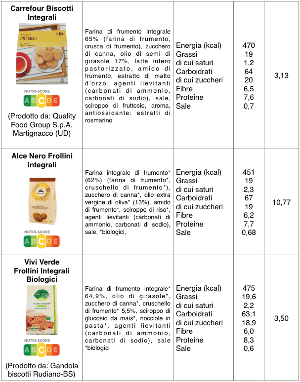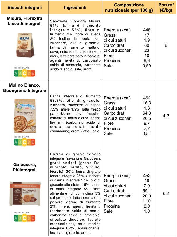 Fra i biscotti integrali e ai cereali considerati, in quelli Carrefour e Alce Nero si specifica la presenza di farina di frumento e crusca, o cruschello (si tratta quindi di farina ricostituita), nei Saiwa invece la farina integrale è solo il 28%, miscelata con farina bianca, integrata da crusca e fibra solubile.