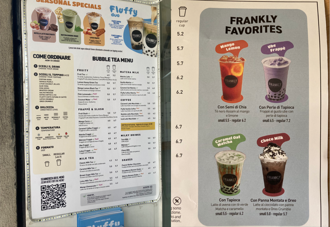 Si sceglie l’aroma, l’eventuale frutta fresca o lo sciroppo, e il ‘topping’ cioè l’aggiunta di ingredienti che caratterizzano gusto e consistenza. Possono essere semplici pezzetti di gelatina, sferette di tapioca, oppure ‘bolle’ gelatinose ripiene di sciroppo che, una volta sorbite con la tipica cannuccia larga, scoppiano in bocca liberando il dolce contenuto (popping bobas). Fra i topping troviamo anche semi di chia, briciole di biscotto, panna montata e altro.
