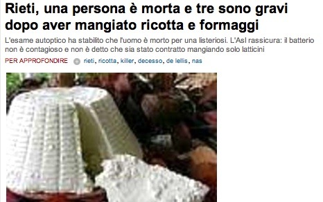 “Rieti: una persona morta e tre intossicati per avere mangiato ricotta e formaggi”. Così titolano diversi quotidiani on line e la stessa notizia viene rilanciata da giornali e radio locali. Il titolo e il tono degli articoli non lasciano spazio a dubbi, a Rieti è stata venduta una partita di ricotta o di altro formaggio contaminati dal batterio Listeria che ha già provocato una vittima. Altre persone sono ricoverate in ospedale per medesimi motivi. Alcuni giornali si spingono oltre e puntano il dito verso la Centrale del Latte di Rieti. La vicenda decolla e il batterio killer diventa la notizia di prima pagina dei quotidiani locali.