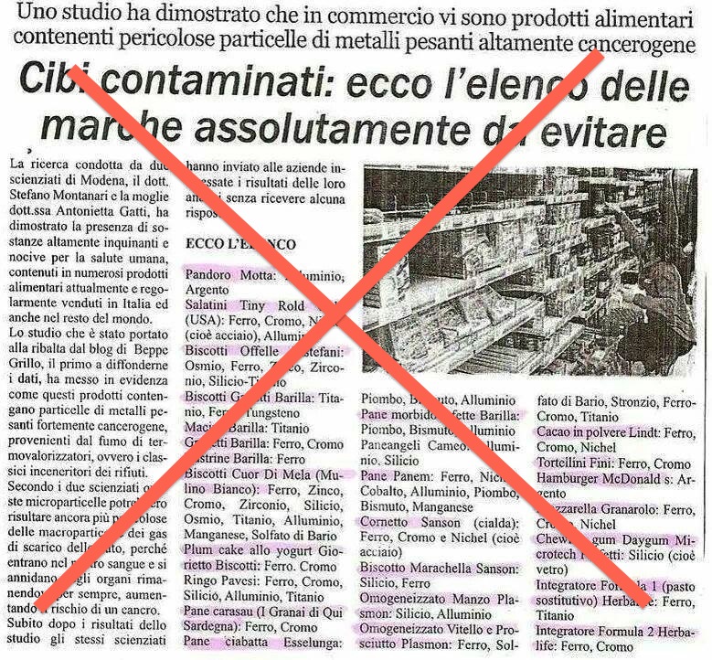 Dopo avere posto l’accento sul rischio di cancro causato dalle microparticelle di questi metalli, arriva la lista dei prodotti e delle marche famose coinvolte, e qui l’articolo diventa una vera farsa. L’elemento vincente della bufala è l’abbinamento tra un noto professore universitario Stefano Montanari, Beppe Grillo e le nanoparticelle che cominciano ad essere utilizzate nel mondo alimentare. Queste storie inventate generano nei lettori la cultura del sospetto, gettando discredito su marchi di prodotti alimentari famosi che ognuno ha nella dispensa o nel frigorifero. Il sistema funziona: da anni circolano in rete bufale e volantini allarmistici e c’è sempre qualcuno che ci crede.