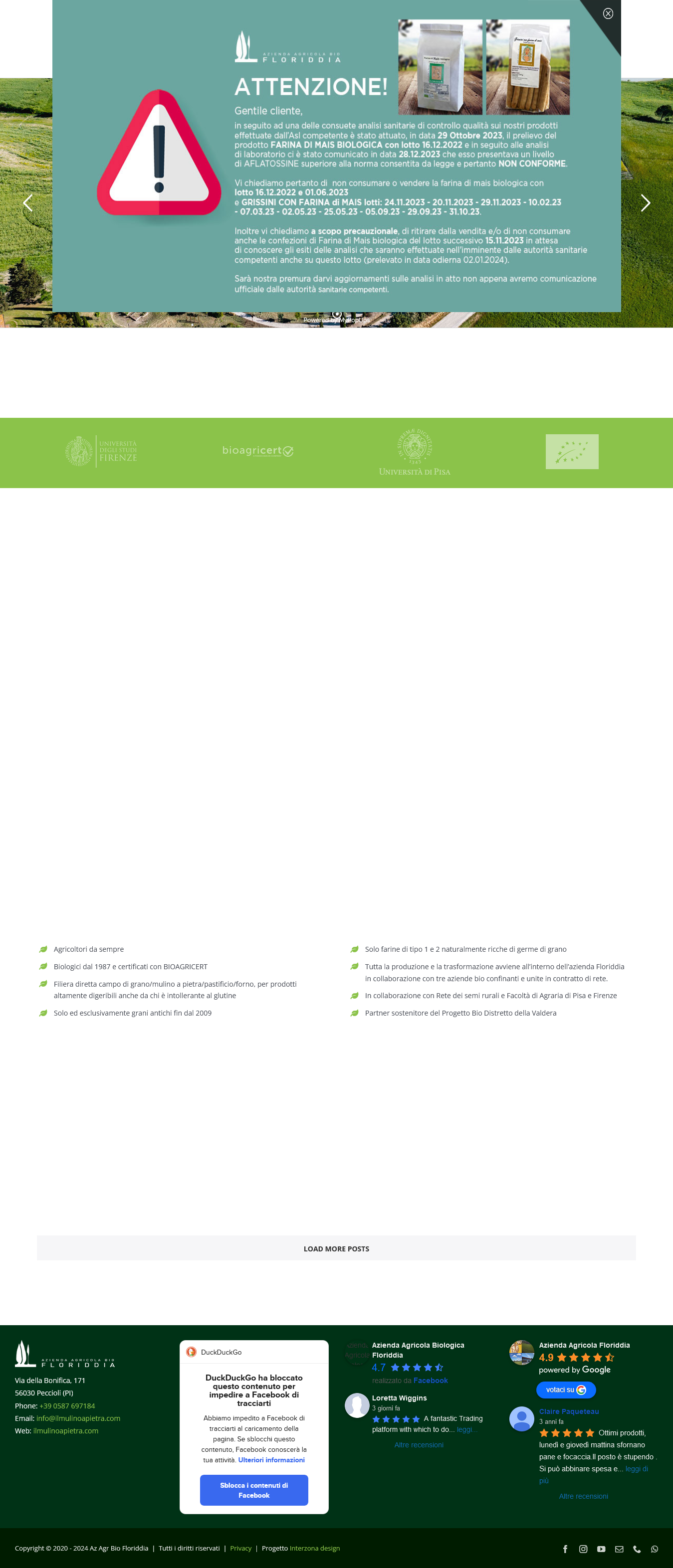 Con riferimento alla farina di mais e ai grissini, di produzione biologica dell’azienda agricola Floriddia vorrei fare alcune considerazioni sui tempi dell’avviso di ritiro di questi prodotti pericolosi. Trascrivo dal loro sito i dati comunicati: la farina è confezionata con lotto 16/12/2022. E’ stata analizzata in data non comunicata, ma il referto è disponibile il 28/12/2023, oltre un anno dopo la commercializzazione del prodotto!