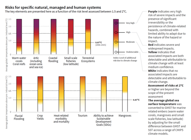 Le barriere coralline potrebbero diminuire del 70-90% a 1,5 °C fino ad arrivare alla quasi totale sparizione a 2 °C. Con danni difficili da calcolare data la complessità di questi ecosistemi, ma con effetti certamente devastanti sul piano sistemico in quanto le barriere coralline sono tra le maggiori riserve di biodiversità del pianeta.