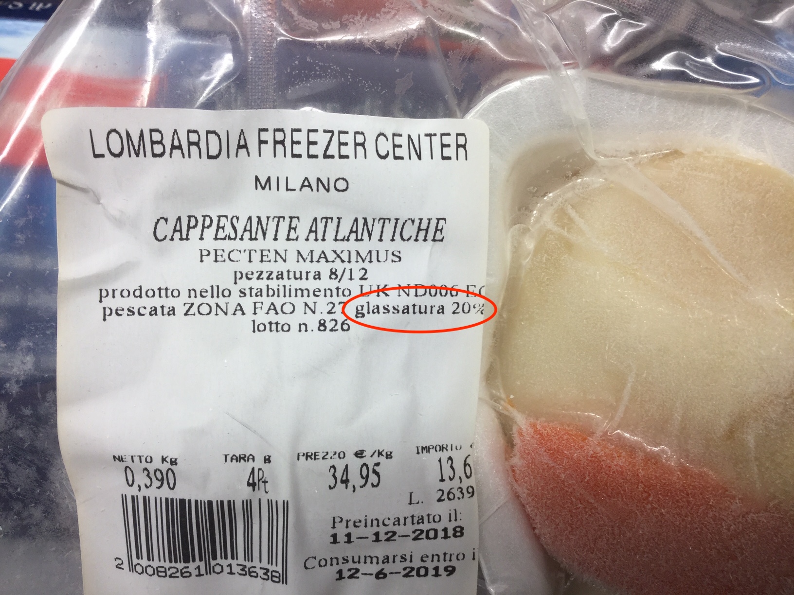 La legge impone di dichiarare in etichetta, accanto alla denominazione di vendita, l’acqua aggiunta, se supera il 5%, così come gli eventuali additivi utilizzati: “Il problema è che è quasi impossibile rintracciare l’acqua interna aggiunta con un’analisi ufficiale, anche se di solito chi aggiunge acqua lo indica tra gli ingredienti”, spiega Tepedino, “per quanto riguarda la glassatura sui prodotti congelati confezionati deve essere indicato il peso netto, e in quelli sfusi bisogna fare attenzione a controllare che il prezzo in evidenza sia riferito al peso netto, e non a quello lordo, come erroneamente a volte accade”.