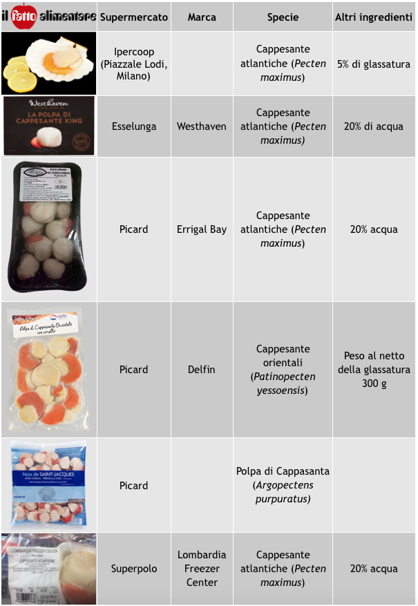 Non resta quindi che leggere con attenzione le etichette per evitare di pagare acqua a caro prezzo. Nella tabella elenchiamo i vari tipi di capesante vendute in alcuni supermercati.