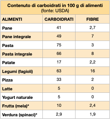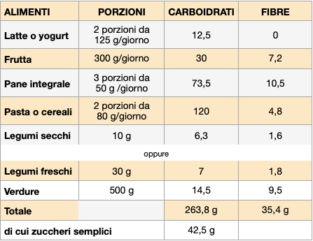 Alla base della piramide della Dieta mediterranea ci sono verdure e carboidrati. Ma in quale quantità? I Larn (Livelli di assunzione di riferimento per nutrienti ed energia) indicano che i carboidrati devono coprire il 45%-60% del fabbisogno calorico giornaliero. Di questi, massimo il 15% può provenire dagli zuccheri semplici. Questo vuol dire che più della metà di quello che mettiamo sul piatto deve essere composto da carboidrati. In pratica un adulto che svolge attività fisica moderata e consuma 2.000 kcal al giorno, dovrebbe mettere nel piatto circa 275 g di carboidrati, di cui zuccheri semplici massimo 75 g.