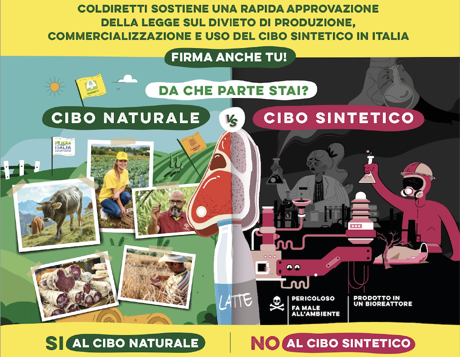 Sostenuto da Coldiretti, dall’Associazione industriali delle carni e dei salumi, dalla fondazione Filiera Italia e dalla stessa presidente del consiglio Giorgia Meloni, il Ddl che impone sanzioni da 10 a 60 mila euro per chiunque immetta sul mercato prodotti alimentari realizzati in laboratorio, ha ottenuto consensi anche nell’ambito della conferenza Stato-Regioni del 19 aprile, facendo leva sulla presunta volontà di tutelare la produzione di carne italiana e la salute dei consumarori rispetto ad alimenti ancora poco conosciuti e studiati, nonché la sua opportunità di acquistare cibo del quale conosce esattamente la provenienza e la composizione.