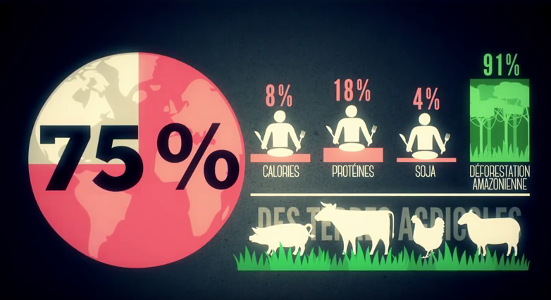 Il video ricorda che gli allevamenti dei bovini, sono la causa del il 14,5% delle emissioni di gas serra, dell’inquinamento delle falde acquifere per via dei liquami e della deforestazione dell’Amazzonia per la creazione di campi di soi destinata ai mangimi.