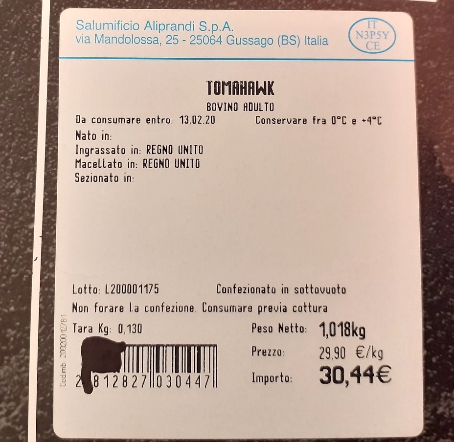 Buongiorno, ho trovato in vendita presso un supermercato della mia zona un prodotto della salumeria Aliprandi di Gussago, la costata di scottona “Tomahwak” frollata 20 giorni. Ho notato che sulla confezione è scritto “100% carne Italiana”, mentre nell’etichetta di tracciabilità con peso del prodotto e origine è scritto altrettanto che trattasi di bovino “ingrassato e macellato nel Regno Unito”, senza alcuna indicazione sulla nascita. È normale? Vi inoltro le immagini della confezione e dell’etichetta. Emanuele