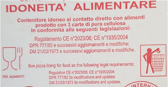 A tutela dei nostri clienti consumatori da sempre raccomandiamo alle nostre pizzerie che bisogna pretendere che i materiali utilizzati ad essere a contatto con gli alimenti siano conformi a norma di legge, e a ogni modo preferire sempre cartoni prodotti in italia. In riferimento ai controlli a parere nostro vanno fatti a monte in maniera preventiva a chi produce la materia prima per i contenitori idonei ad essere a contatto con gli alimenti alimentari. E’ buona prassi igienica che la pizza prima di essere posta nei cartoni per asporto lasciarla qualche minuto ad evaporare l’Umidità di cottura e abbassare di temperatura al fine di cedere il meno possibile il vapore (sviluppato dagli ingredienti in cottura) al contenitore. al fine di gustare al meglio la qualità della pizza arrivato a casa può riscaldarla se possibile a forno tradizionale.