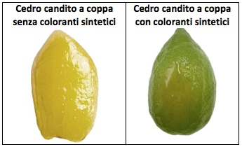 La colorazione dei prodotti alimentari con coloranti permessi dalle autorità è legale ma è eticamente scorretta. Infatti si tratta di una mera operazione di cosmesi degli alimenti finalizzata ad attrarre i consumatori meno attenti e maggiormente esposti al rischio di essere abbagliati dalle apparenze. Nel caso del cedro candito, il verde intenso impartito impiegando coloranti sintetici, come il blu brillante FCF e il bruno patentato V, può essere percepito erroneamente come segno di genuinità del prodotto. In effetti si tratta soltanto di un trucco per conferire artificialmente un colore attraente alla scorza del cedro che durante il processo di canditura diventa di un colore sbiadito per la perdita dei pigmenti colorati che contiene (foto).
