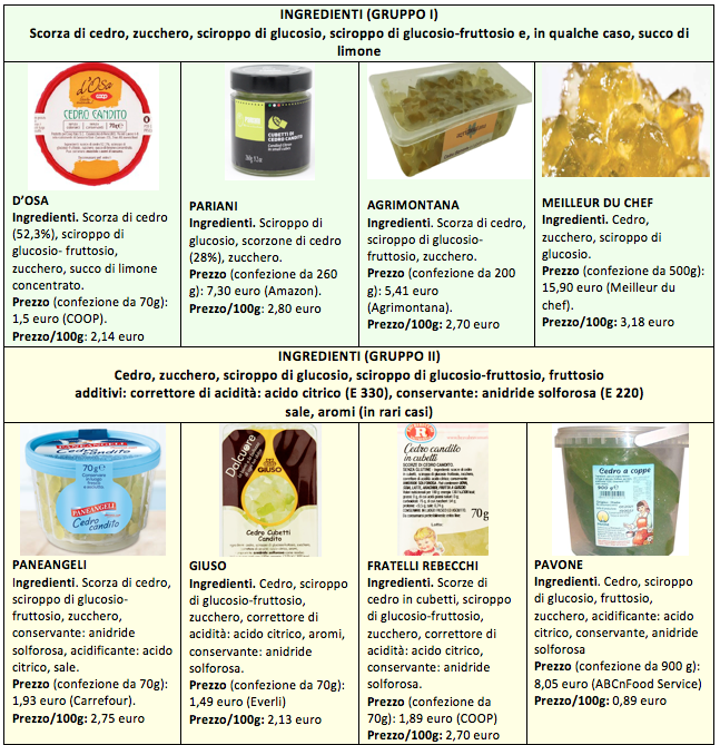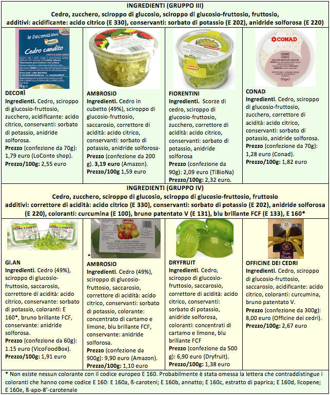 Nella misura in cui si va dal primo al quarto gruppo i prodotti si allontanano sempre di più dalla ricetta casalinga (scorza di cedro e zucchero) perché gli ingredienti diventano progressivamente più numerosi. E ovviamente la qualità va scadendo. I cedri canditi del primo gruppo contengono soltanto scorza di cedro, zucchero e dolcificanti ricavati da un fonte naturale, l’amido (sciroppi di glucosio e di glucosio-fruttosio). In qualche raro caso è presente anche succo di limone. In aggiunta agli ingredienti dei prodotti del primo gruppo, quelli del secondo gruppo contengono due additivi alimentari, un correttore di acidità, l’acido citrico (E 330), e un conservante, l’anidride solforosa (E 220); quelli del terzo anche un secondo conservante, il sorbato di potassio (E202); e infine quelli del quarto anche coloranti, tra cui due sintetici, il blu brillante FCF (E 133) e il bruno patentato V (E 131). Il primo gruppo è quello che comprende il minor numero di marche. Il secondo invece ne include il maggior numero. Poiché i cedri canditi di quasi tutte le marche di questo gruppo hanno la stessa composizione, è lecito sospettare che siano prodotti da poche ditte e poi commercializzati con marchi diversi.