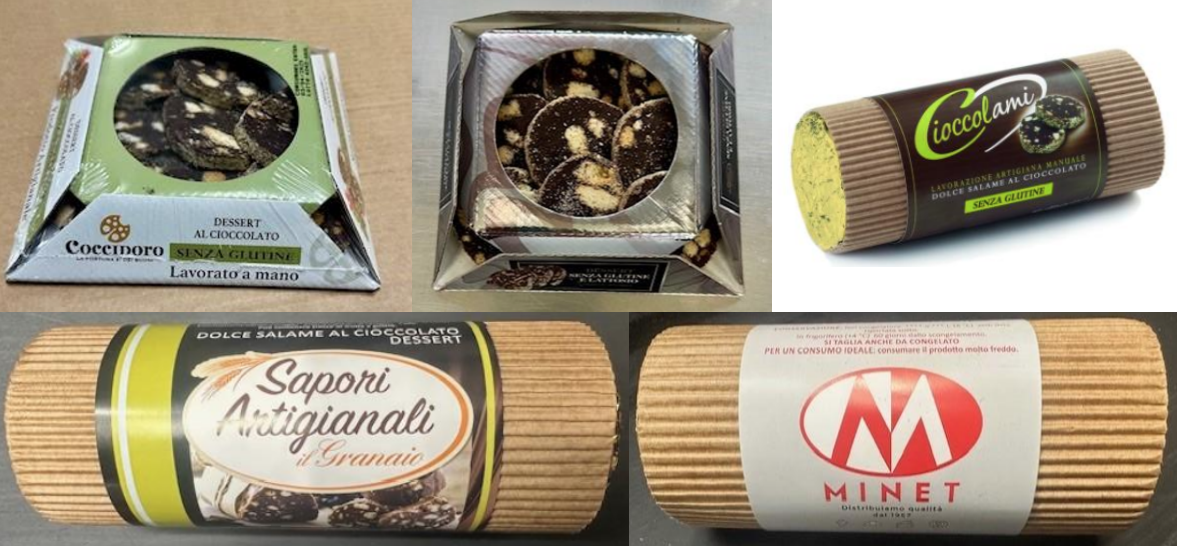 - Dolce salame al cioccolato dessert senza glutine Cioccolami, venduto intero in tubi caneté da 500 grammi con il numero di lotto L4324-SGSL e i TMC 11/2026 e 12/2026.