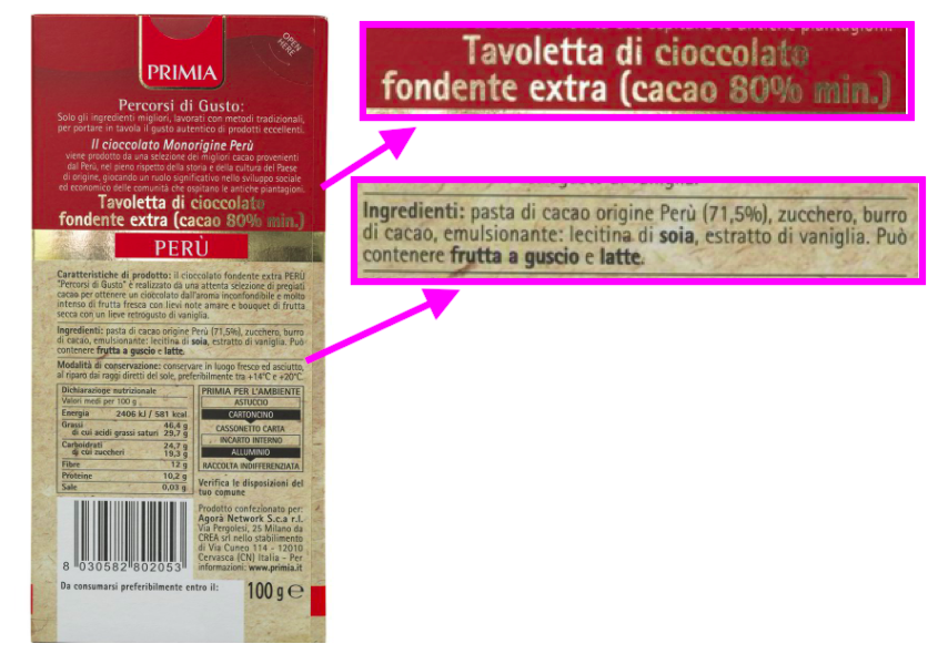 Ho acquistato al supermercato una tavoletta di cioccolato fondente, attratto dalla copertina che recava una chiara scritta: “FONDENTE EXTRA PERÙ 80% CACAO”. A casa leggendo la composizione degli ingredienti ho scoperto che la tavoletta è fatta di, cito testualmente, “pasta di cacao origine Perù (71,5%)”. Questo è il cioccolato in questione. È corretto scrivere 80% di cacao, chiaro e grande, sul packaging e poi scoprire che il cacao è, in realtà, solo al 71,5%? Giacomo