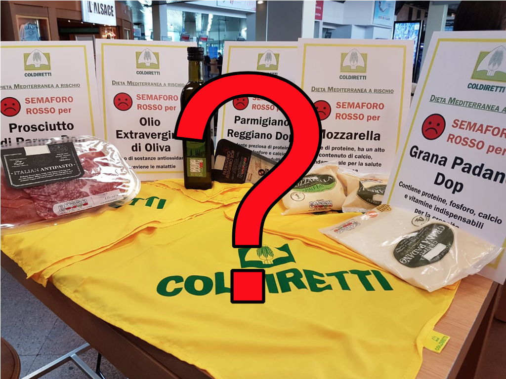 A un’attenta analisi, però, ad apparire fuorviante è proprio l’attacco di Coldiretti alle etichette a semaforo. Per sostenere la tesi secondo cui la maggior parte dei prodotti che caratterizzano il Made in Italy vengono bocciati alla prova del semaforo, l’organizzazione ha preso come riferimento una confezione di Grana Padano, una di Parmigiano Reggiano, una mozzarella, una bottiglia di olio di oliva extravergine e una busta di prosciutto di Parma. Sul tavolo imbandito a fianco di questi prodotti appariva un cartello su cui campeggia un triste bollino rosso. Ma il modo secondo cui è stato assegnato il cartellino rosso è confuso e fumoso.