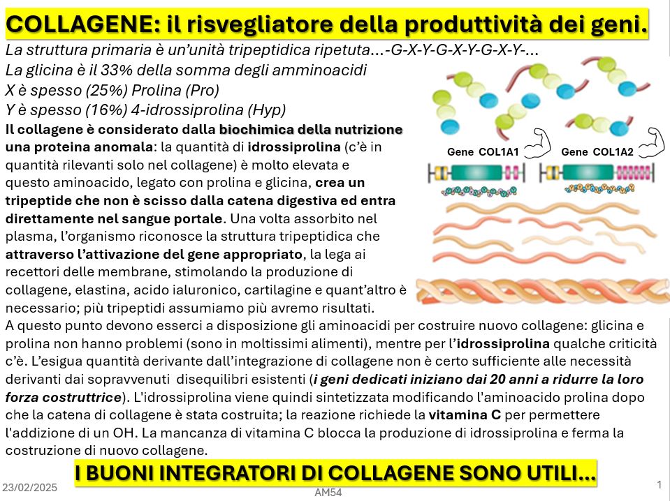 E’ allora evidente che per una corretta fornitura (anche di collagene) bisognerebbe ricorrere piuttosto ad un adeguato apporto proteico: basti pensare che le problematiche fisiche alla cui prevenzione e trattamento ambisce la supplementazione di collagene, sono dovute al processo di invecchiamento che è accompagnato dalla progressiva riduzione della capacità di sintesi proteica (es. la sarcopenia) e dal contemporaneo accumulo di radicali liberi.