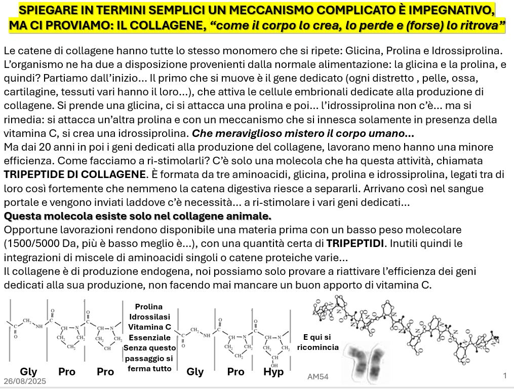 Come facciamo a ri-stimolarli? C’è solo una molecola che ha questa attività, chiamata TRIPEPTIDE DI COLLAGENE. È formata da tre aminoacidi, glicina, prolina e idrossiprolina, legati tra di loro così fortemente che nemmeno la catena digestiva riesce a separarli. Arrivano così nel sangue portale e vengono inviati laddove c’è necessità… a ri-stimolare i vari geni dedicati…
