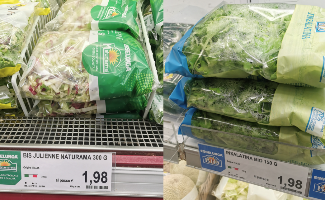 Ma vediamo cosa è cambiato negli ultimi anni da un punto di vista economico. Nel 2023 avevamo pubblicato un articolo facendo una comparazione dei prezzi tra il prodotto fresco e quello imbustato in un supermercato di Ferrara. A distanza di due anni, abbiamo fatto un giro nei supermercati di Milano (Carrefour, Esselunga e Ipercoop) per vedere i prezzi delle insalate in busta.