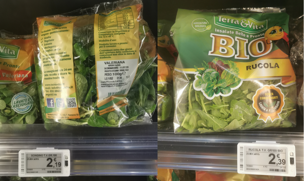 Ma vediamo il prezzo del prodotto confezionato. Al Carrefour, la linea Bio Belle e pronte di Terra e Vita in confezioni da 100 grammi ha prezzi variabili: la valeriana costa 17,90 €/kg, il songino 21,90 €/kg, la rucola a 23,90, e l’insalata Rustichella costa ben 27,20 €/kg (confezioni da 125 grammi).